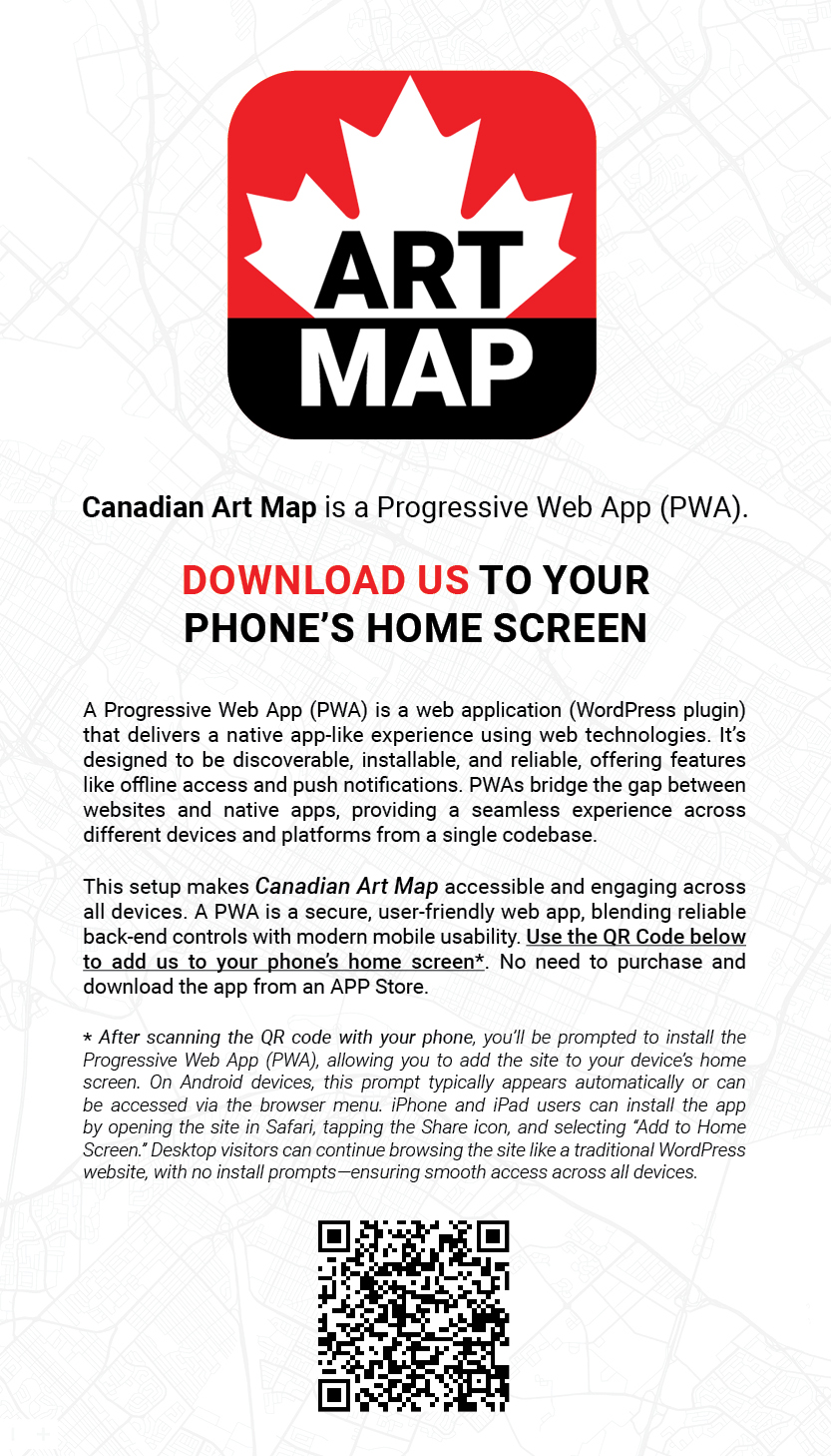 Canadian Art Map is a user-friendly Progressive Web App (PWA)—a web-based platform that bridges the gap between traditional websites and native apps, offering a seamless experience across devices. The site invites you to explore and deepen your appreciation of Canadian art and culture, connecting you with the rich diversity of artists, art venues, and creative activity across Canada.